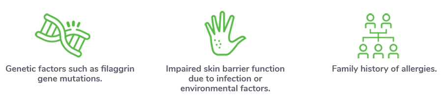 There are various gene changes that affect the skin barrier and immune response, increasing the likelihood of eczema. Environmental factors, such as allergens and other irritants, can trigger and exacerbate symptoms, leading to flare-ups.